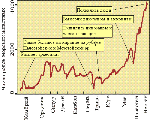 Этот знаменитый график, построенный американским палеонтологом Дж. Сепкоски, показывает, как изменялось разнообразие морских животных за последние 600 миллионов лет (с начала палеозойской эры до современности). Время на графике "течет" слева направо (левый край графика - 600 млн. лет назад, правый - современность). Резкие минимумы соответствуют "великим вымираниям". Кризис, о котором мы рассказали подробно (когда вымерли динозавры и аммониты), соответствует последнему из этих минимумов - между мелом и палеогеном.